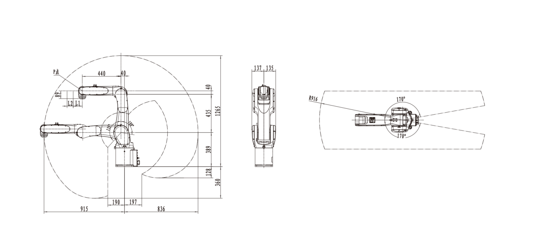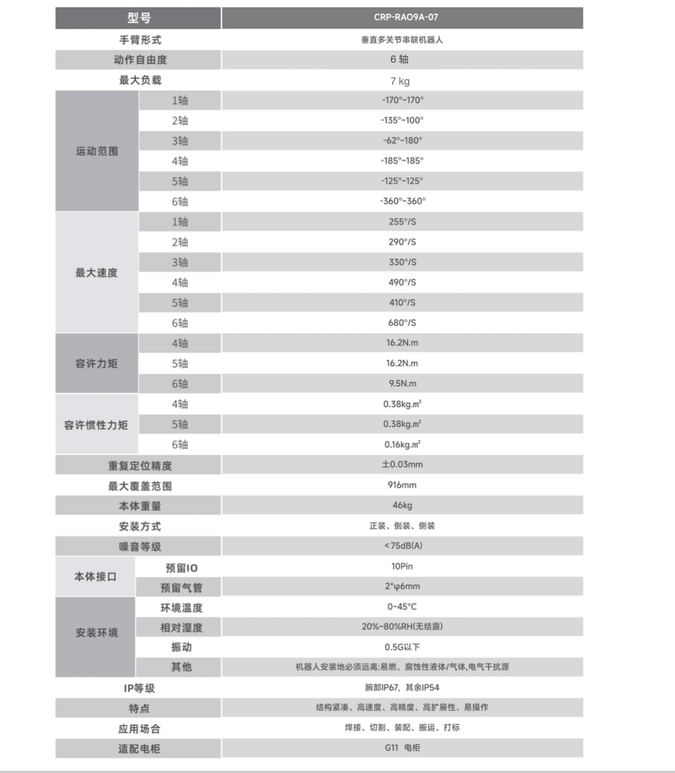 臂长916mm,手腕负载容量大,额定负载7kg,可轻松应对多种应用场合。
